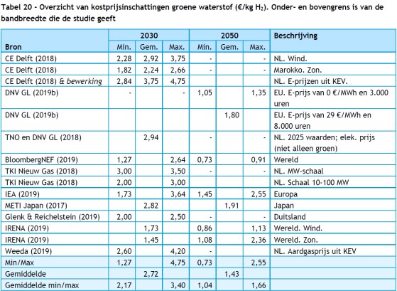 In de meest recente studie van PBL zijn de productiekosten van groene waterstof in een aantal onderzoeken met elkaar vergeleken op basis van een onderzoek van CE Delft uit 2020: